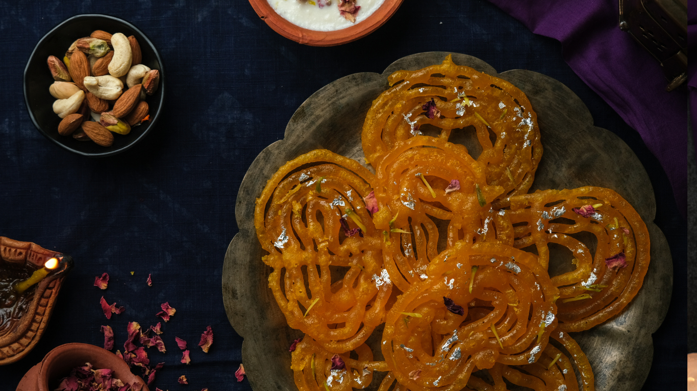 Jalebi is a sweet, crispy spiral dessert fried in ghee, soaked in aromatic syrup, undernoted with saffron; giving it the natural vibrant orange colour.