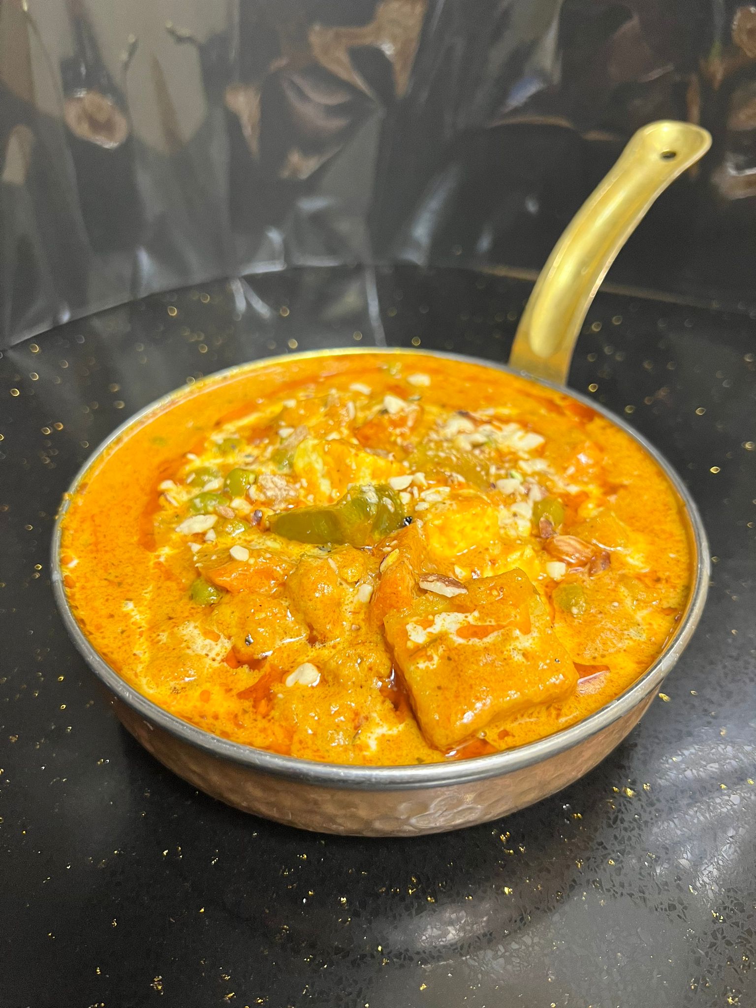 Authentic Amritsari chicken sautéed in tomato and cashew gravy, garnished with coriander and cream