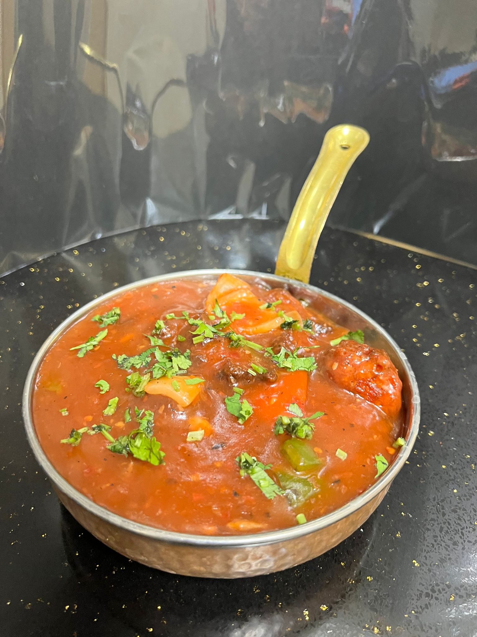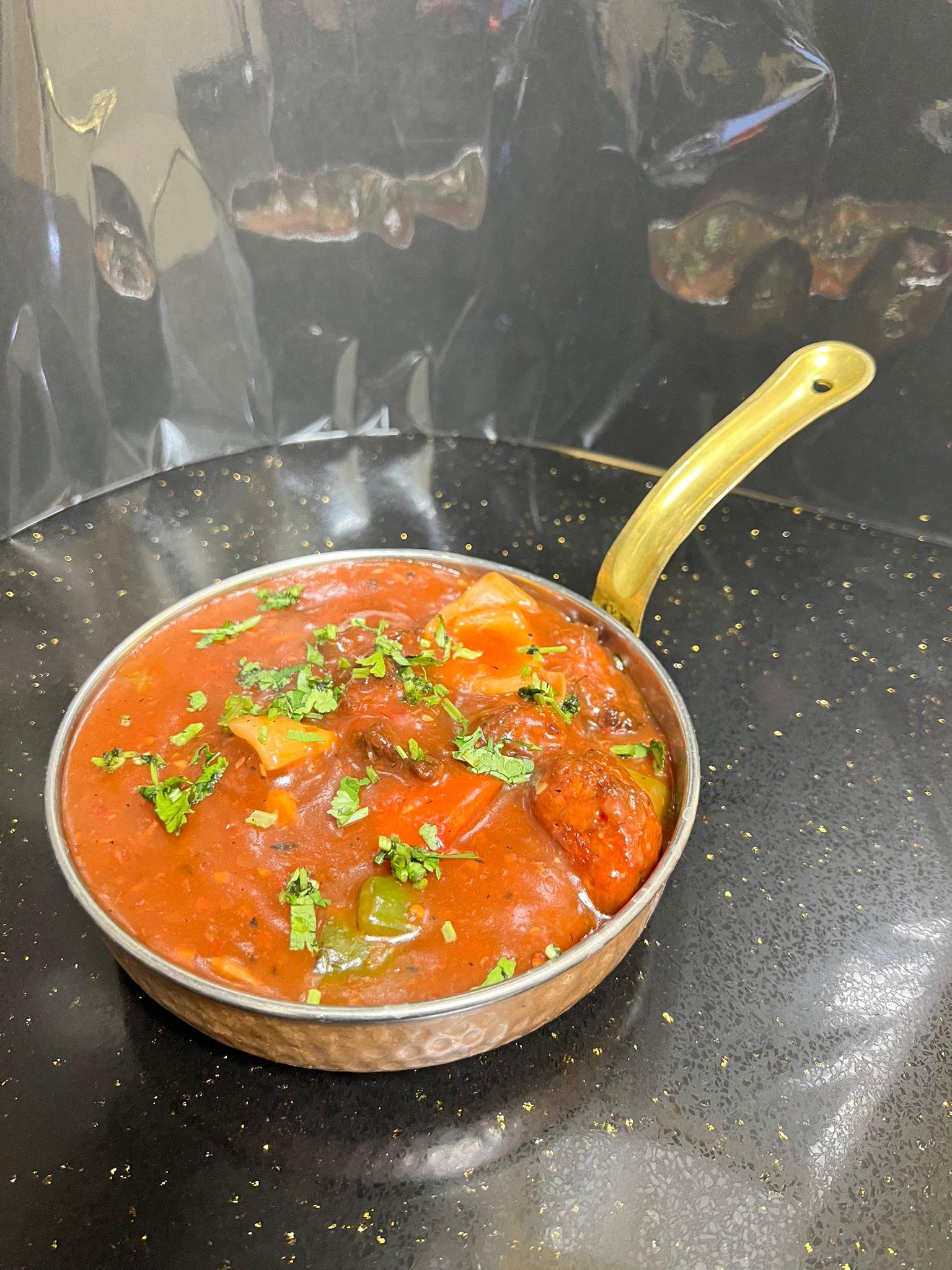 Tender pieces of meat sautéed with chopped onions and green peppers in our signature tomato based sauce is then finished with a touch of methi leaves (fenugreek)